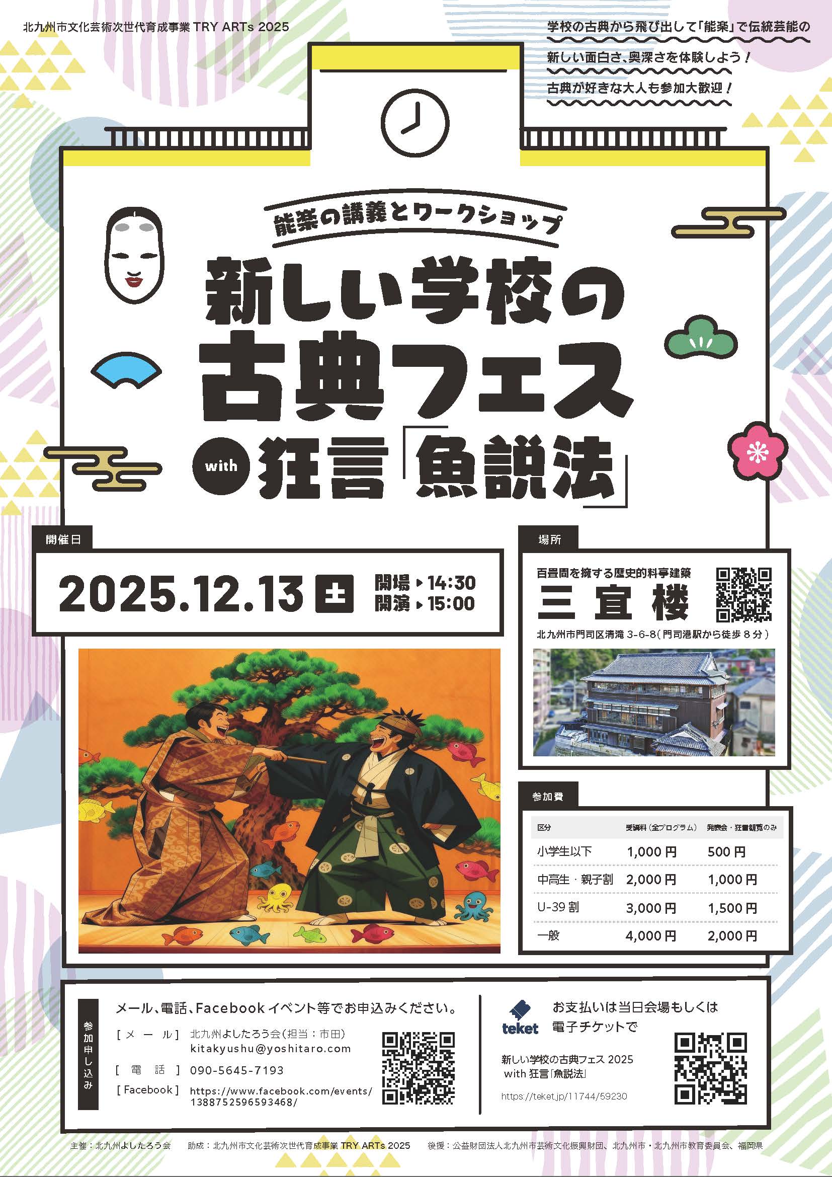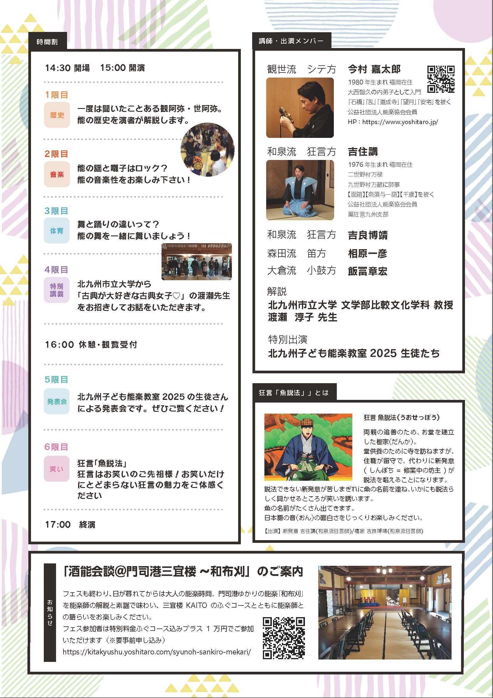 門司港にある歴史的建造物・三宜楼で、学校の時間割形式で能楽を楽しく学びます。1限目から4限目までは観世流シテ方などの能楽師達や北九州市立大学の先生から能楽の歴史、音楽、舞、門司港との関わりを体験的に学びます。5限目は北九州子ども能楽教室の生徒たちによる発表会、6限目は和泉流狂言方による「魚説法」が上演されます。