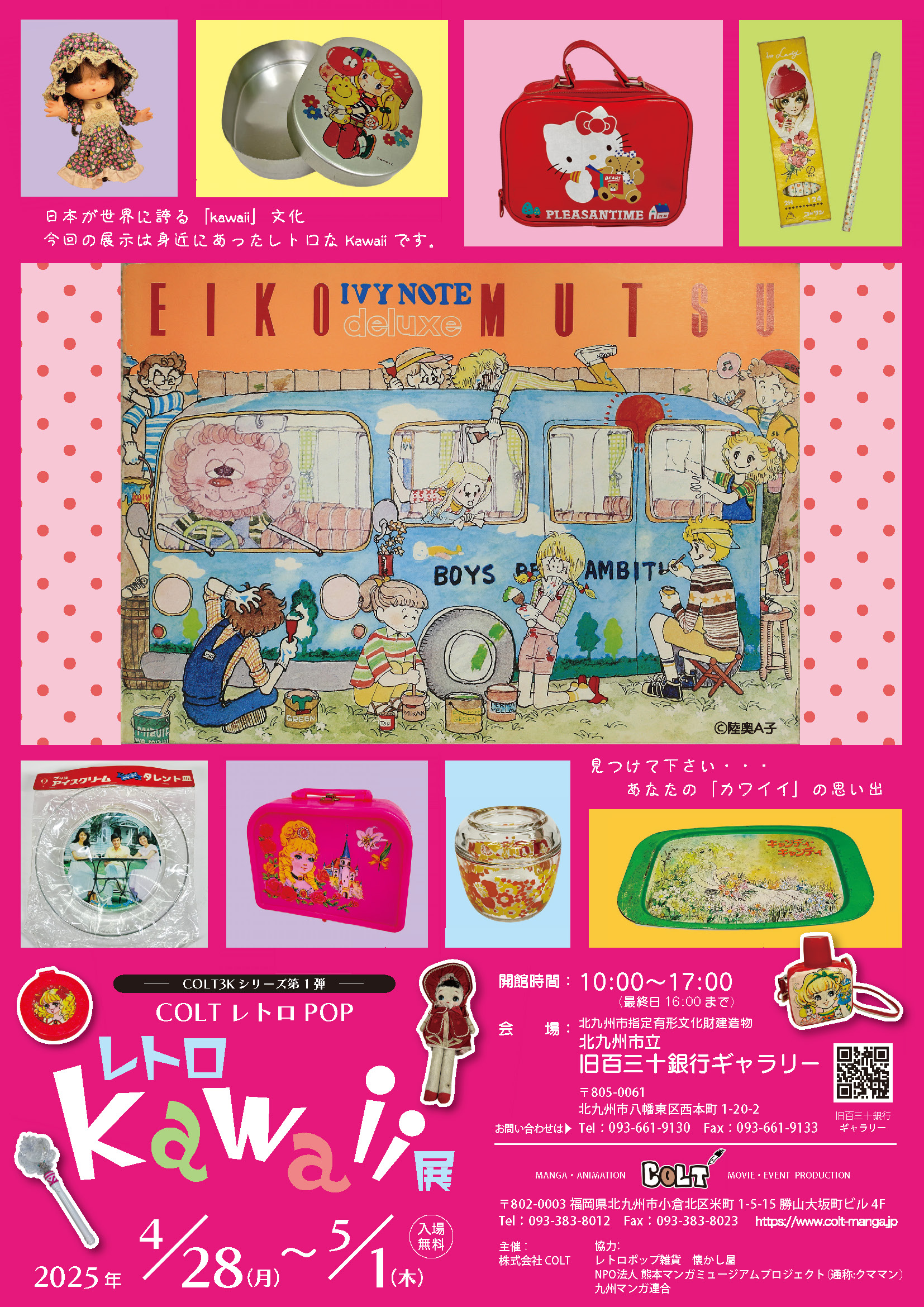 日本のカワイイ文化は世界に影響を与える独自の魅力を持っています。おもちゃ、マンガ、人形、キャラクター、イラスト、ファンシーグッズ、食器等々昭和~平成~令和と続いています。(それ以前の時代にもカワイイ文化はありますが、今回は主に1970年代~80年代以降を展示)