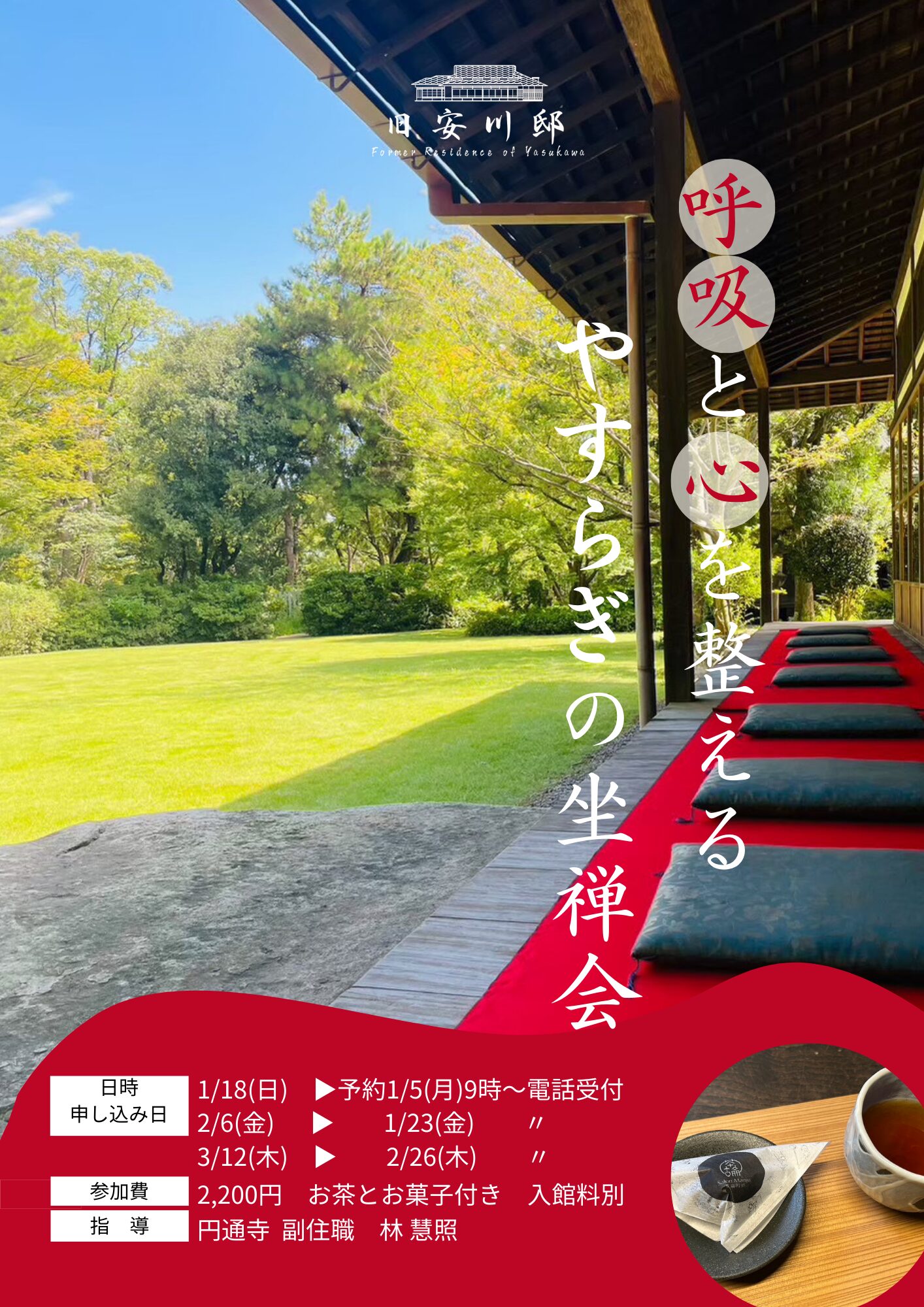 内容:座禅体験 15分×2回 (無理のない範囲でどうぞ)カフェにてティータイム