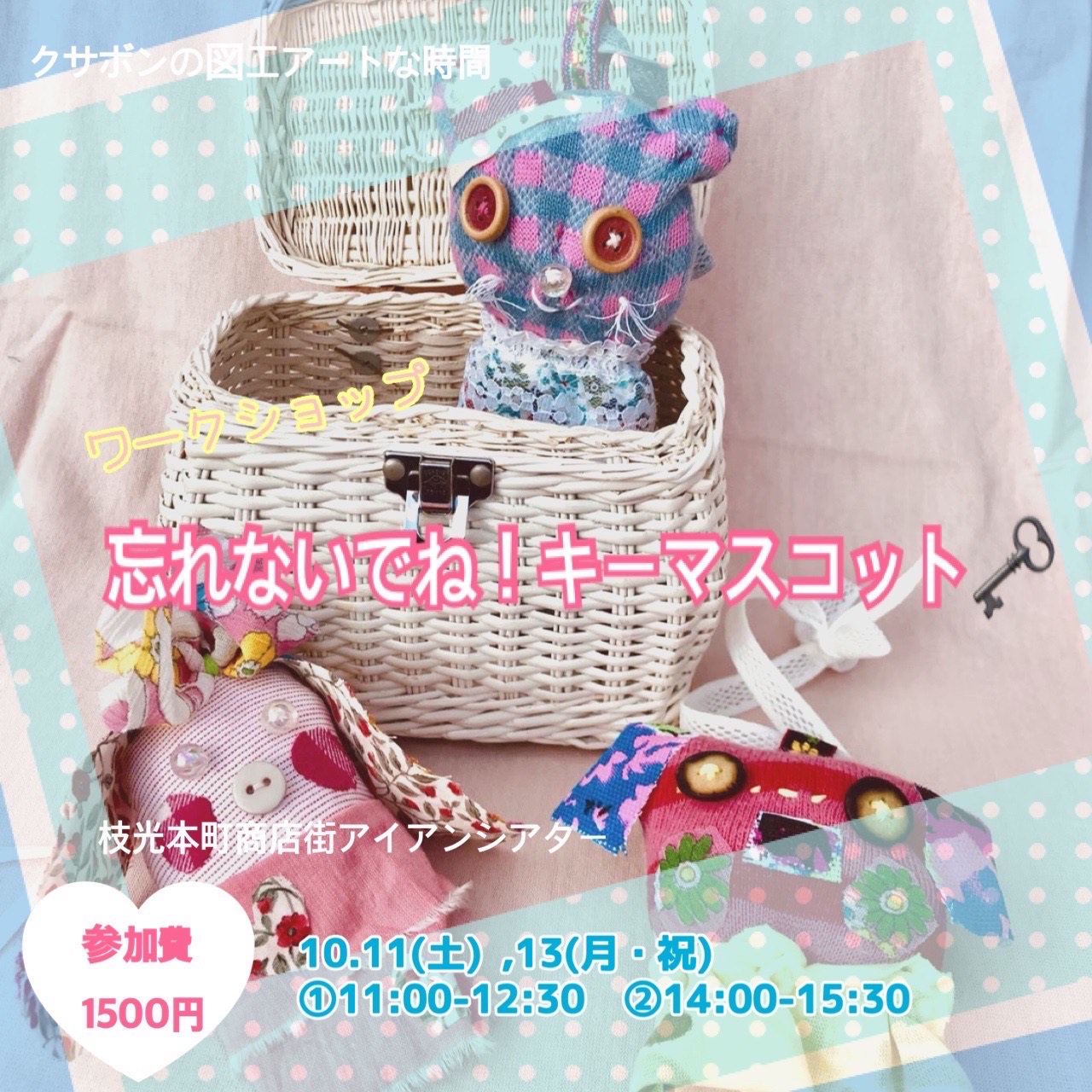 お家や車のカギ、大事なものを付けられるオリジナルマスコットを作ります。つい忘れちゃう小さなものに、かわいいマスコットを付けていつもお供に♪♪