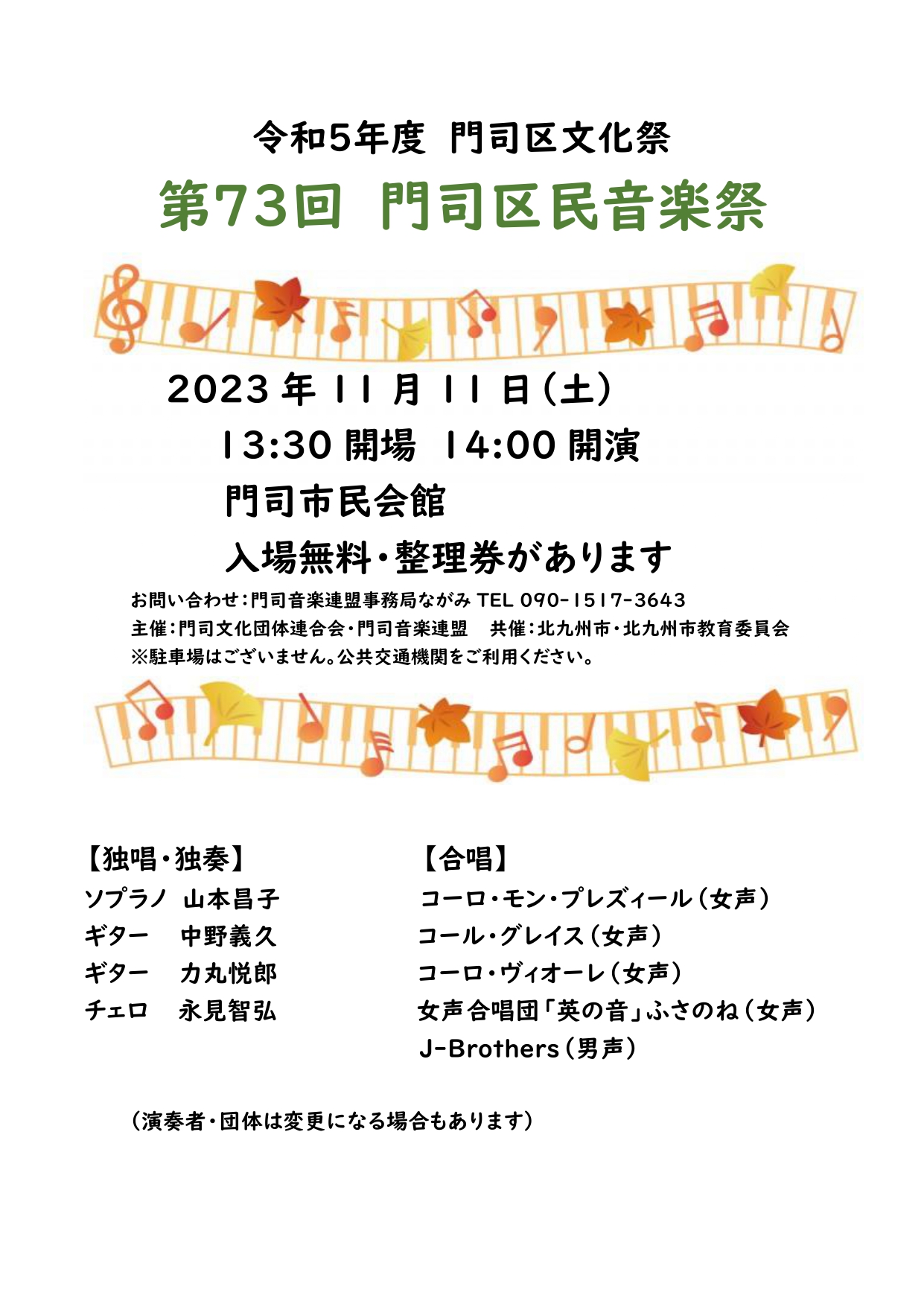 門司在住の音楽家による女声および男声合唱や声楽、ピアノ、ギター、チェロで、クラシックや日本の歌、映画音楽などを演奏します。