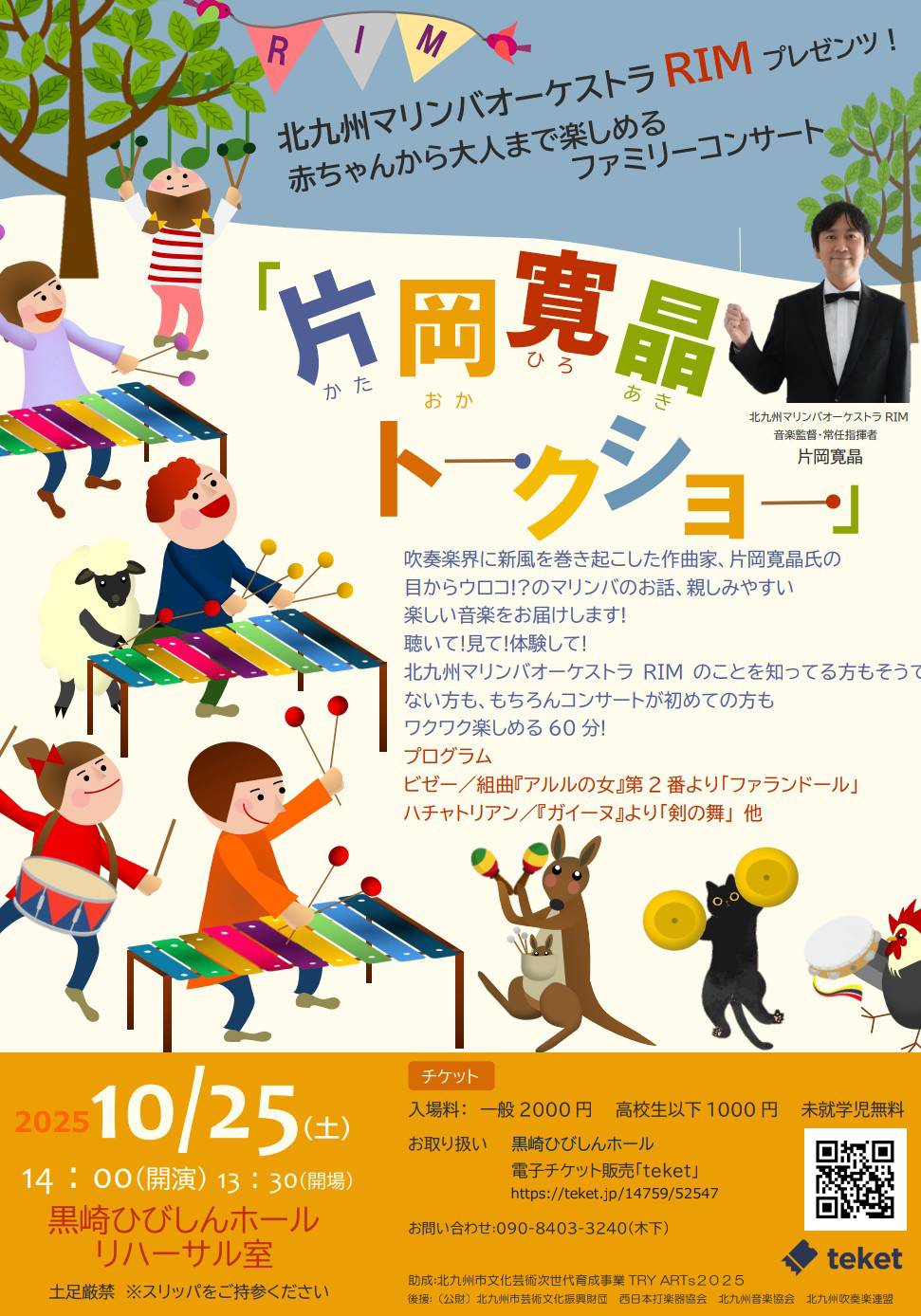 北九州マリンバオーケストラRIMの音楽監督・常任指揮者である片岡寛晶氏の目からウロコ!?の音楽のお話や親しみやすい音楽をマリンバのあたたかいサウンドでお届けします。赤ちゃんから大人の方まで聴いて!見て!体験できる!わくわく楽しめるコンサートです。
